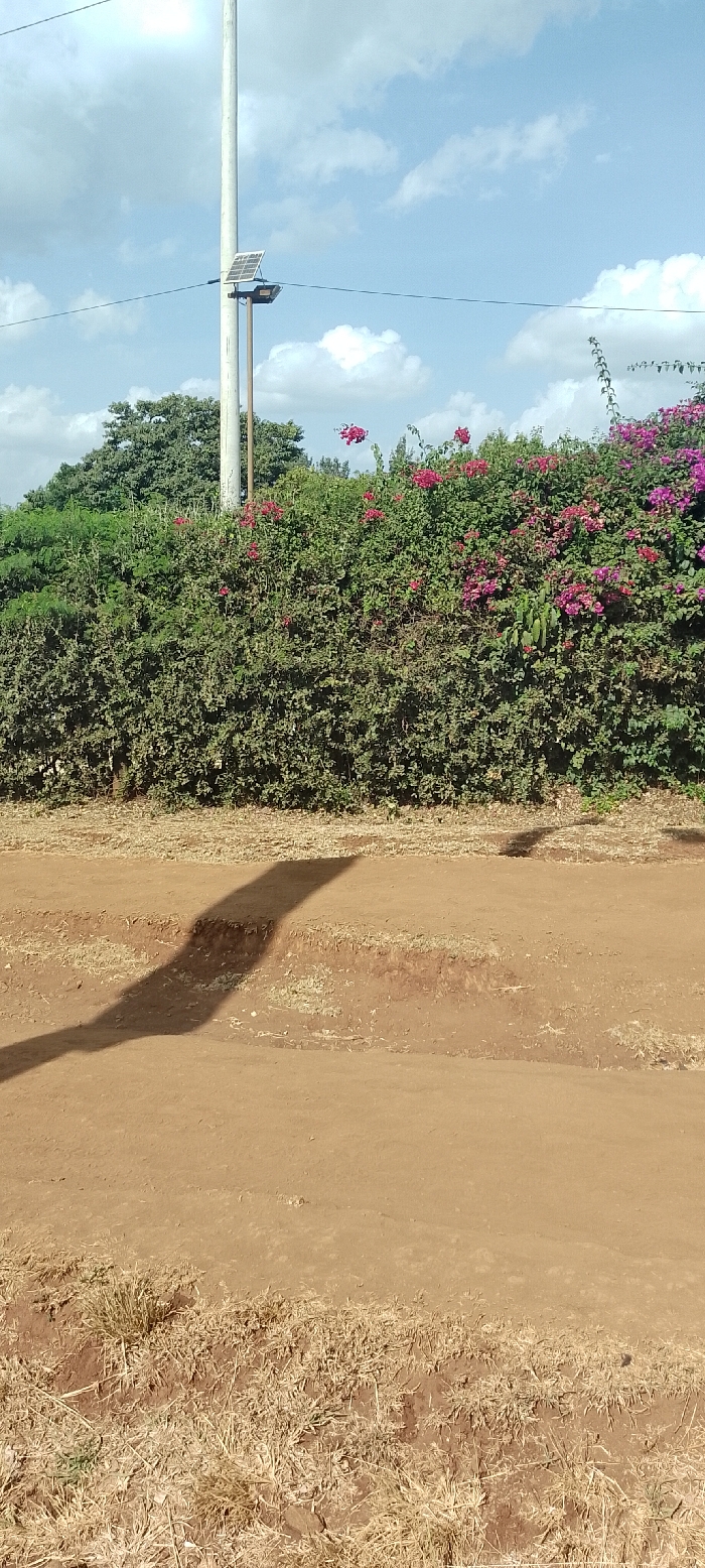 The scene depicts an outdoor environment in Karingani ward, Kenya, under a partially cloudy blue sky. A tall, light-colored utility pole stands prominently on the left, supporting a small solar panel angled upwards and a downward-facing light fixture. Two thin, dark horizontal wires extend from the pole across the mid-sky. Behind the pole, a dense green hedge, adorned with clusters of pink and purple bougainvillea flowers, runs across the mid-ground. Taller green trees are visible above and behind the hedge. The foreground consists of reddish-brown bare earth, exhibiting multiple subtle terraced levels and sparse patches of dry, light-brown grass. A long, dark shadow, consistent with a pole, extends diagonally from the lower-left across the foreground ground. No individuals or animals are visible.