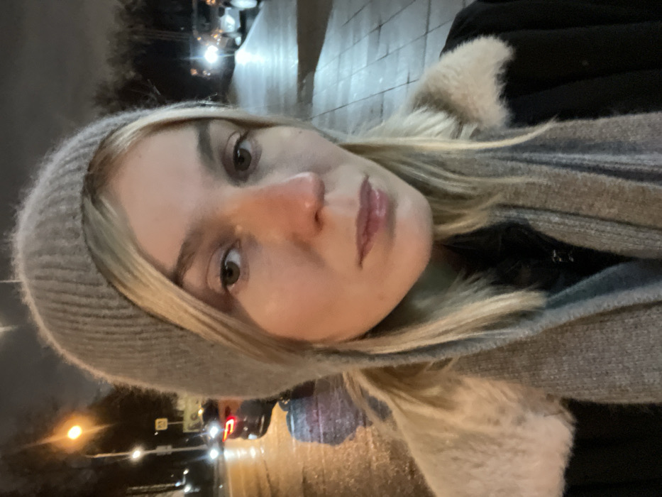 A close-up, chest-level portrait taken at night depicts an individual with fair skin and blonde hair, looking directly at the camera