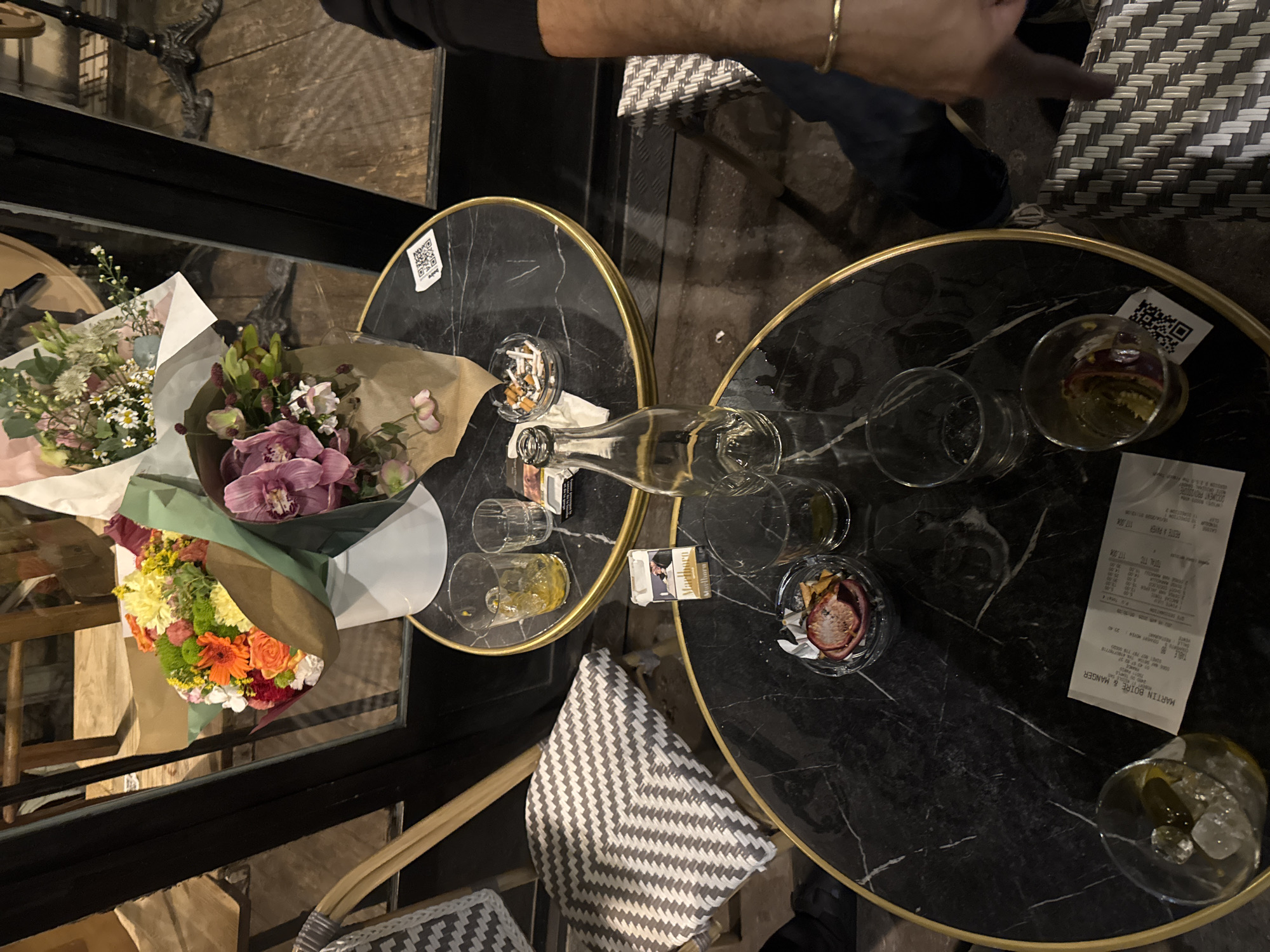 The image depicts a scene in Paris, France, at the restaurant "Martin Boire & Manger." Two small, round marble-topped tables with gold trim are visible. One table holds three bouquets of flowers, while the other has an empty bottle, several empty glasses, cigarette packs, and a receipt for 117.00 euros. An ashtray containing cigarette butts also sits on the table with the flowers. A person's arm wearing a gold bracelet is visible in the upper right corner of the image, suggesting someone is seated at the table. A woven chair is located at the table with flowers.