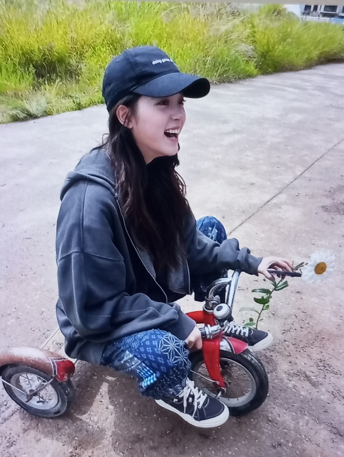 An outdoor scene in Aktash, Uzbekistan, depicts a young female individual seated on a small tricycle on a paved surface