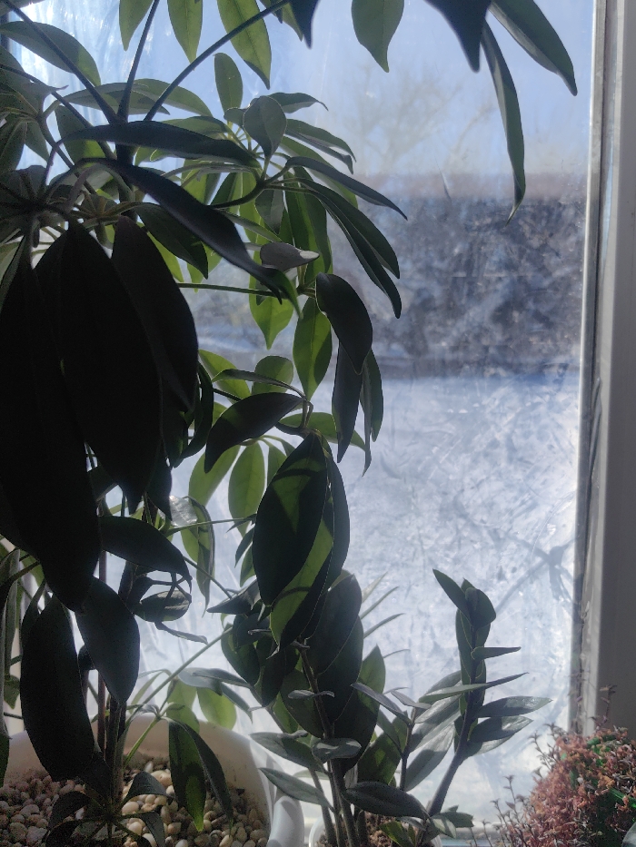 Indoor plants thrive in front of a grimy window. A Schefflera arboricola, or umbrella tree, dominates the view with its radiating leaves. A Zamioculcas zamiifolia, known as a ZZ plant, sits alongside with its upright, glossy foliage. Reddish-brown sedum adds a touch of color at the edge. The plants are potted in white containers, the Schefflera's soil covered with pebbles. Natural light streams through the window, highlighting the leaves.