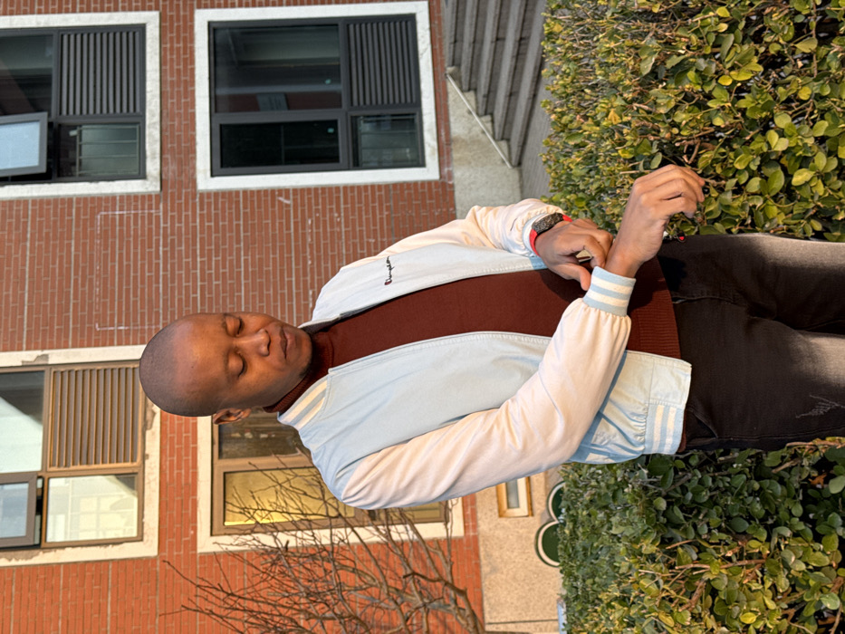 An outdoor, medium shot captures a single adult individual in what appears to be Beijing City University, Daxing District, China. The person, exhibiting dark skin and a bald head, is dressed in a maroon turtleneck sweater, a light blue and white varsity-style jacket with a "Champion" logo on the left chest, and dark trousers. A red-banded digital wrist device is worn on the left wrist. The individual's gaze is directed downwards as their left hand interacts with the cuff of their right sleeve, appearing to adjust it. The background features a multi-story building constructed of red brick, with multiple dark-framed windows, some partially open and others fitted with dark external louvers. Green hedges are visible in the foreground, bordering a walkway. Bare deciduous tree branches are present on the left, and stone steps leading upwards are partially visible on the right. The scene is illuminated by natural sunlight, casting warm tones.