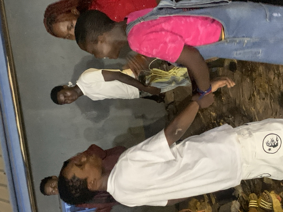 A group of five people stand together in what looks like an indoor setting. One person wears a red shirt. Another wears a pink shirt and blue overalls. Two individuals wear white shirts. One of the white shirts has a logo on the back. Some people are conversing with each other, while others are looking in different directions. The scene is dimly lit, with some areas more exposed to light.
