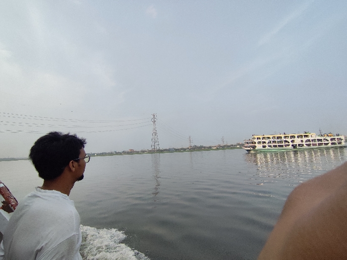 The image displays a riverine environment in Narayanganj, Bangladesh, under an overcast sky. The perspective is from a low vantage point on a moving vessel, evidenced by the wake in the lower left quadrant. In the immediate foreground, slightly left of center, an adult male is visible from behind and his left profile. He wears a white t-shirt and glasses, with short, dark, curly hair. He is looking towards the right, across the river. A reddish-brown object is partially visible near his left shoulder. The midground features a wide expanse of choppy, grey-green river water. On the right, a large, multi-deck passenger vessel, primarily white with a light green lower hull and yellow trim, moves across the water from right to left. Figures are discernible on its upper decks. In the background, the distant riverbank is low-lying, with sparse green vegetation and indistinct structures. A prominent, dark-colored electrical transmission tower (pylon) stands on this bank. Multiple power lines extend horizontally from the tower across the upper left portion of the sky. The sky itself is a uniform, light grey.