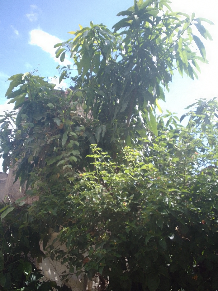 The image captures an outdoor scene in Juja ward, Kenya, on a bright, sunny day with a blue sky and scattered white clouds. The foreground and midground are heavily dominated by lush green vegetation. A large tree with broad, dark green leaves occupies the upper right and central portions of the frame. To the left, a dense mass of lighter green foliage, possibly a vine, covers and partially obscures a weathered, light-colored building or wall structure. In the lower center and right, another bush with numerous small, light green leaves is visible. No individuals or animals are present within the frame.