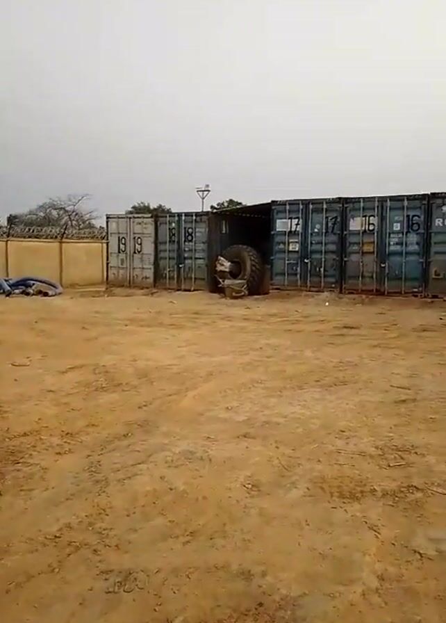 wide, flat, dirt-covered area. Along one side is a row of metal shipping containers, each a different color and labeled with numbers. The numbers run from 19 to 9. Some containers have tires near their openings. The area is bordered by a fence on one side. In the distance, some vegetation and palm trees are visible. The sky is overcast and the light is muted. The video is slightly shaky.