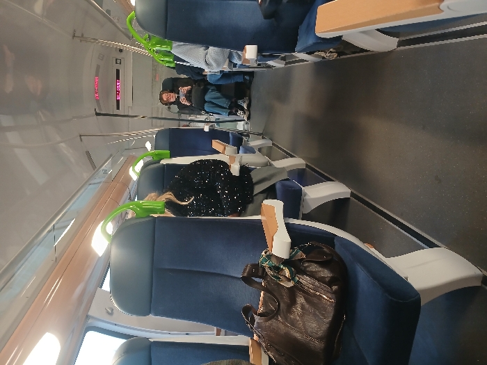 The interior of a train car reveals rows of blue cushioned seats with white accents. Some seats are occupied by passengers, including one in a black sequin top and another further down the aisle. A brown leather bag is prominently displayed on a seat in the foreground. Overhead, green grab handles and digital signage are visible, and sunlight streams through the windows.