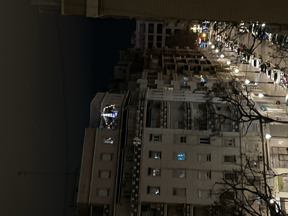 A nighttime shot of tall buildings illuminated by streetlights. One building, closer in view, features lit windows and a Christmas decoration, while others fade into the background, their details obscured by distance and shadows. Bare tree branches frame the buildings, adding a textured foreground element. The sky is dark, contrasting with the artificial lights.