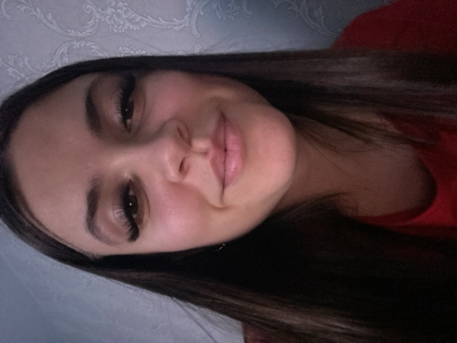 A young woman smiles gently. She has dark hair, enhanced eyelashes, and full lips. Her skin appears smooth and lightly flushed. She wears a red top. The background features a lightly patterned wall, possibly wallpaper, in shades of blue and white. The photo is slightly tilted.