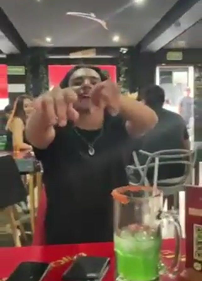young man sitting at a red table in what appears to be a restaurant or bar. He's wearing a black shirt and has dark hair. He is pointing at the camera with both hands and making gestures with his fingers. There's a large glass of green liquid with ice and a salted rim on the table in front of him, along with a wallet and a cell phone. In the background, other people are seated at tables and moving around. The restaurant seems to have some decorative greenery and a painted ceiling. The lighting is relatively bright.
