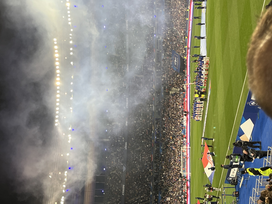 soccer field at the Stade de France in Saint-Denis, France (latitude: 48.924, longitude: 2.36). The field is green and the stands are full of spectators. A large banner reading "FRANCE" can be seen above the crowd. In the foreground, a group of soccer players are lined up in a formation, likely waiting for the start of a game. There is a large French flag spread on the field, with several people holding it. There are also several people in green shirts, possibly staff, working on the field. The air is filled with smoke, possibly from pyrotechnics, creating a hazy atmosphere. There are many lights illuminating the stadium. The image is taken from behind the goal. The bottom of the frame is obscured by a spectator's head.