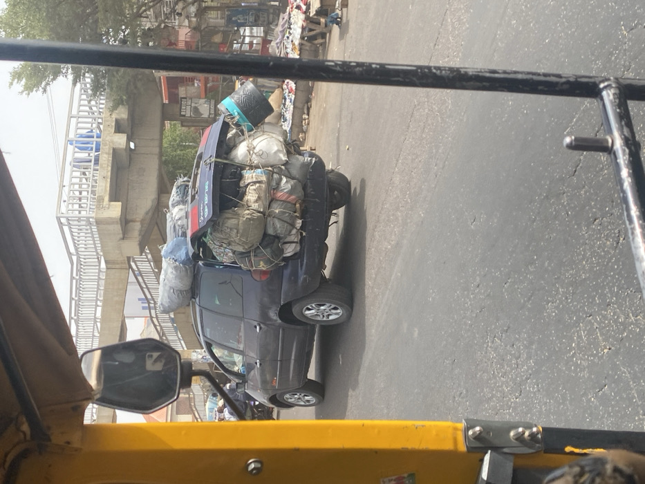 This image depicts a street scene in Kawo, Nigeria, observed from the interior of a yellow vehicle. A dark-colored minivan/SUV, possibly navy blue, occupies the center, heavily overloaded with cargo. Numerous bundles, sacks, and a blue plastic bucket are secured to the vehicle's open rear hatch with ropes, extending significantly from the back. Additional cargo is stacked on the roof rack. The vehicle is positioned on a paved road displaying minor cracks. In the mid-ground, a concrete pedestrian overpass with metal railings spans the road; two individuals are visible on its surface, one in blue attire. To the right, a bustling roadside market operates with goods laid out on the ground and low tables, and several indistinct individuals are present among stalls. Buildings with partial signage, including "BENICE" and "MECHANICAL WORK," are visible beyond the market. The foreground shows the yellow frame and side mirror of the observer's vehicle, which reflects a blurred interior element. The scene is illuminated by bright daylight, suggesting clear weather conditions.