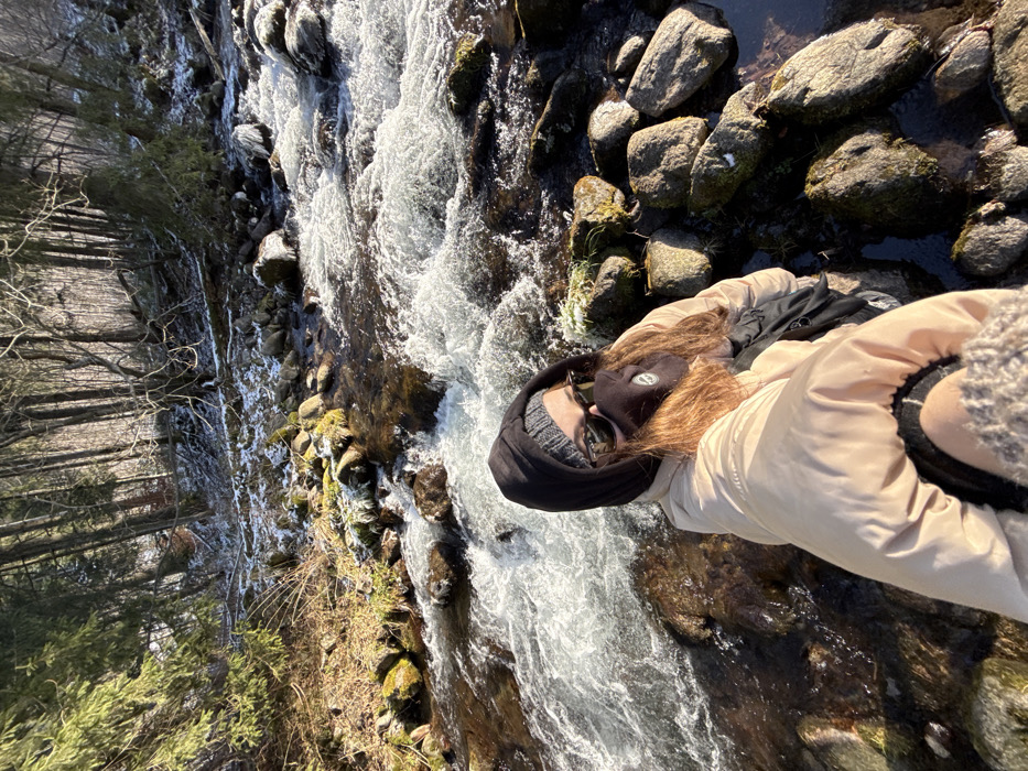 An individual is partially depicted in the foreground, positioned near a rapidly flowing, rocky stream within a wooded area of Zakopane, Poland. The individual wears a black hooded garment, a grey knit beanie, dark sunglasses, a black face mask featuring a white circular emblem, and a light beige puffy jacket. Reddish-brown hair is visible. A black gloved hand is extended, holding a device consistent with taking a selfie. The lower edge of the frame reveals fuzzy, light-colored material, indicative of footwear. The stream, flowing from background to foreground, exhibits turbulent white water and numerous dark, exposed rocks. Moss and ice patches are present on rocks within the water and along its banks. The banks feature dry vegetation and sparse snow. The background consists of a dense forest containing both coniferous and bare deciduous trees, with snow covering areas of the forest floor. The scene is illuminated by direct sunlight, casting highlights on the water, snow, and vegetation.