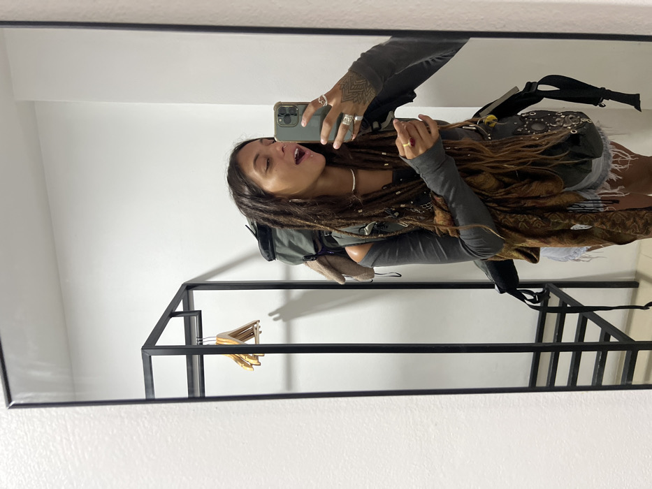In a mirror selfie, a woman with dreadlocks sticks out her tongue