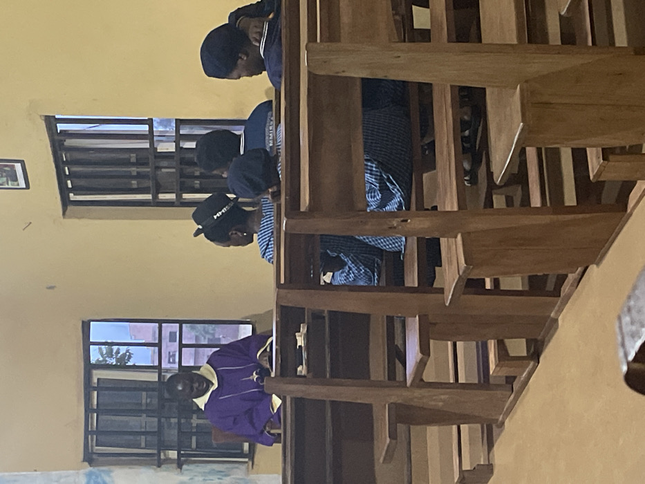 In a room with yellow walls, a man in a purple and white robe stands near a window with visible frames. Above him, three individuals are seated in what appears to be tiered seating or wooden pews, viewed from the side. The seating is made of light brown wood. The background includes glimpses of the outside through the windows, featuring buildings and greenery.