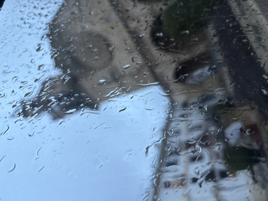 rain-streaked window with blurred buildings reflected on it