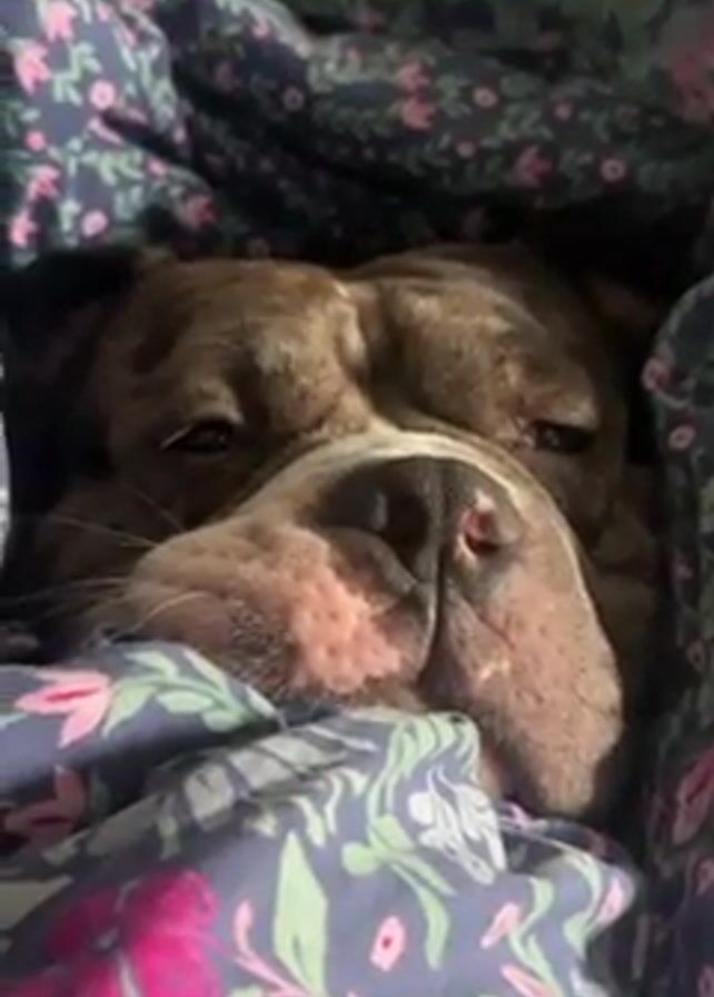 A close-up shot features a brindle bulldog comfortably nestled under a floral-patterned blanket