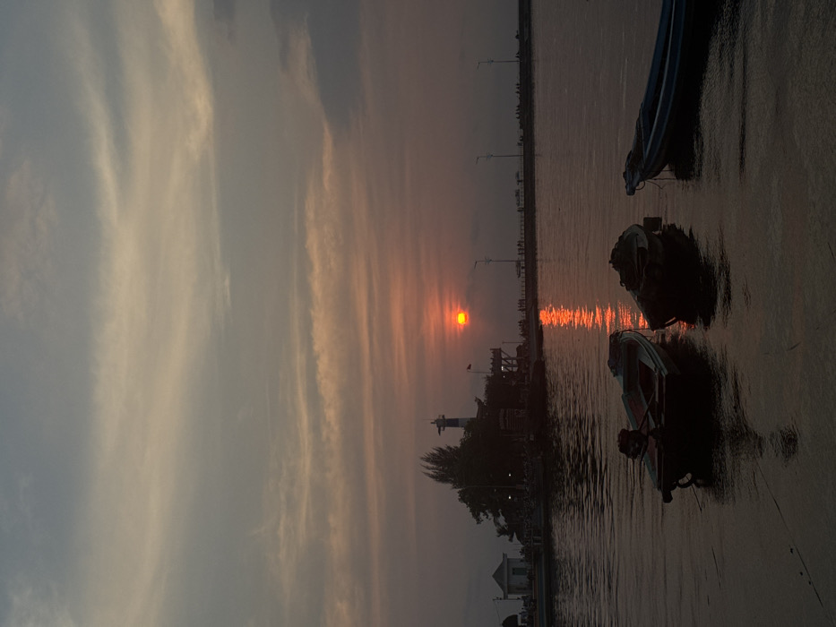 An outdoor, wide-angle photograph captures a sunset scene at Dinh Cậu Temple in Duong Dong, Phú Quốc, Vietnam. The bright orange-red sun, partially obscured by thin clouds, is positioned in the upper-middle right quadrant, casting a reflective orange streak across the dark, calm water in the midground and foreground. The sky exhibits varying shades of grey, orange, and pink hues, indicative of a sunset. In the immediate foreground, three small boats are silhouetted against the water. From left to right: one dark, possibly green, boat with an outboard motor visible at its stern; a second smaller, darker boat with visible contents that appear to be fishing nets; and a third, lighter-colored (possibly blue) boat. All boats appear anchored or moored. In the midground, to the left of the sun's reflection, the Dinh Cậu Temple complex is visible on a landmass or rocky outcrop. A distinctive white lighthouse with horizontal dark bands stands prominently, adjacent to a traditional Vietnamese temple structure with a dark, multi-tiered roof. Trees and foliage surround these structures. Further to the left on the shoreline, a small white building with a light-colored roof is discernible. To the right of the Dinh Cậu complex, a long concrete pier or promenade extends along the coastline. Multiple individuals are visible on the pier as dark silhouettes, either standing or walking. Several modern-style lampposts are evenly spaced along the pier. The overall illumination indicates dusk. No specific interactions between people are discernible due to the distance and low light.