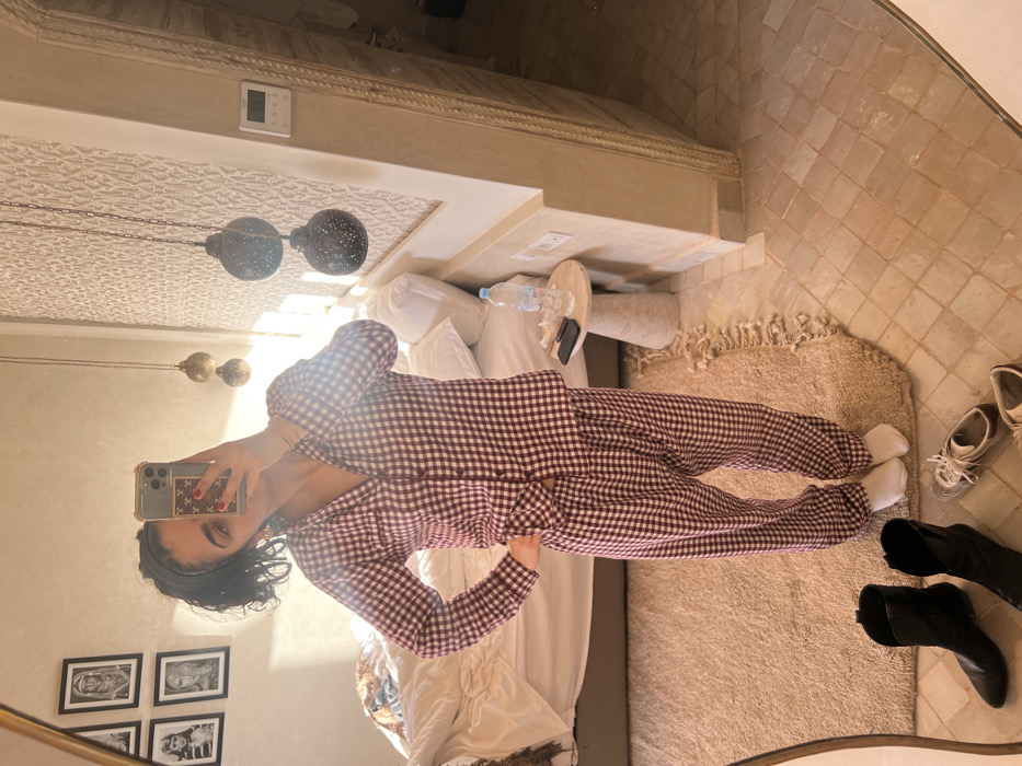 This image depicts an indoor scene within a room located in Rissani, Morocco, captured as a mirror selfie. A female individual, with dark, curly hair tied back, stands centered in the frame, wearing a two-piece maroon and white gingham patterned pajama set and white socks. She holds a gold-colored smartphone with a patterned case, obscuring her face, to take the photograph, with her left hand placed on her hip. Behind the individual to the left is a disheveled bed with white linens. To the right of the bed, a light-colored, tapered stone nightstand holds a plastic bottle of "Sidi Ali" water and a pair of glasses. Above the nightstand, two Moroccan-style hanging pendant lamps are visible: a smaller brass-toned one and a larger, dark, perforated spherical lamp. The wall behind the bed features an ornate, textured pattern. On the wall to the left, four black-and-white framed portraits are arranged in a grid. The floor in the immediate foreground consists of a light-colored, textured rug with fringed edges, upon which a pair of black leather cowboy boots and a pair of light-colored athletic sneakers are placed. Beyond the rug, a floor of square, terracotta-toned tiles extends. Warm natural light illuminates the room from the right, casting shadows. An air conditioning unit or thermostat is mounted on the wall to the far right.