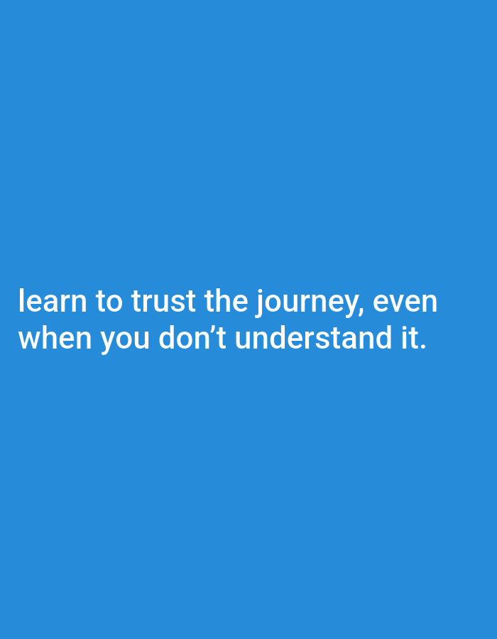 The image displays a digital graphic with a uniform, solid medium blue background. Centered horizontally in the lower portion of the frame, white sans-serif text reads, "learn to trust the journey, even when you don't understand it." The scene consists solely of this text against the uniform background, with no discernible physical environment, structures, people, objects, or actions visible that would indicate a specific geographical location, such as within the city of Khiva, Uzbekistan.
