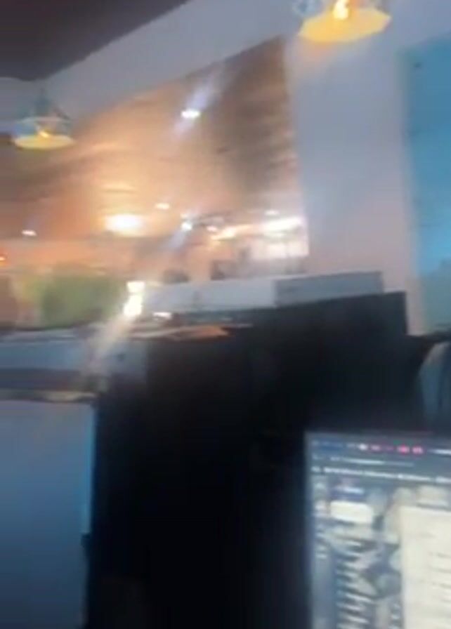 The camera pans upwards from a close shot of a computer screen to reveal a brightly lit office space. Several cubicles with multiple computer monitors are visible. Hanging light fixtures illuminate the space. Artwork hangs on the walls.
