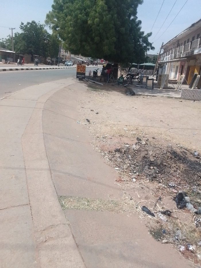 The image captures a street scene in the city of Katsina, Nigeria, where Muhammadu Dikko Stadium is located, under a clear, bright sky. A paved asphalt road curves gently to the left from the foreground, bordered on the right by a concrete curb and a wide, unpaved dirt shoulder. This dirt shoulder exhibits significant refuse, including plastic bags, miscellaneous debris, and a prominent, dark, burnt pile of organic and inorganic waste in the immediate foreground. On the right side of the frame, a large tree with dense green foliage provides shade. Beneath this tree, a red and white "POS" (Point of Sale) sign with black lettering is displayed, accompanied by multiple parked motorcycles and a green object marked with the number "24". A single individual is visible seated beneath the tree near the POS sign. To the right, a two-story commercial building with a light-colored facade features multiple windows and visible air conditioning units. Various items, including what appear to be mirrors, aluminum or plastic window frames, and possibly doors, are displayed on the ground outside this building, leaning against its facade. On the paved road in the mid-ground, a white car is observed traveling away from the viewer. Additional vehicles and indistinct figures, some on motorcycles, are discernible further down the street. Utility poles and overhead power lines are present against the light blue background sky.
