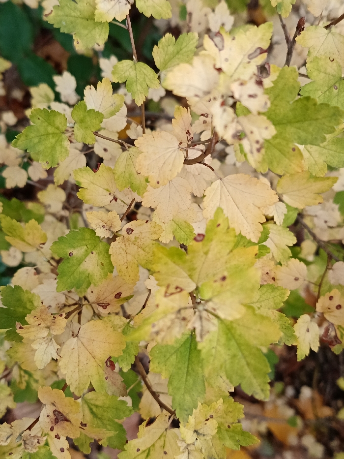 This image presents a close-up, top-down view of plant foliage, located in Kamenz - Kamjenc, Germany. The scene is composed of numerous lobed leaves, exhibiting a transition of color consistent with autumn, ranging from light green to pale yellow and chartreuse. Many individual leaves feature small, irregular dark brown spots. Thin, reddish-brown stems are visible, supporting the clustered leaves. The background is out of focus, consisting of additional plant material in darker greens and browns, indicative of an outdoor, natural environment. No people, active subjects, or specific interactions are depicted.