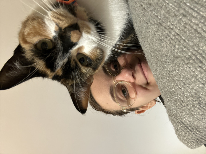 The scene depicts one human and one cat in a domestic indoor setting, located in Birmingham, United Kingdom. The foreground features a calico cat, predominantly black, orange, and white, positioned centrally and to the right, facing the camera with amber-green eyes. A segment of a blue and orange patterned collar is visible around its neck. White whiskers extend from its muzzle. To the left and slightly behind the cat, a human individual, identified as an adult female, is partially visible. She wears clear-framed glasses and possesses dark hair. Her face is directed towards the camera, exhibiting a slight smile. A large, textured grey textile object, consistent with upholstery or a blanket, occupies the left side of the frame and largely obscures the human's body. The background is a plain, light-colored wall. Both subjects appear to be observing the camera.