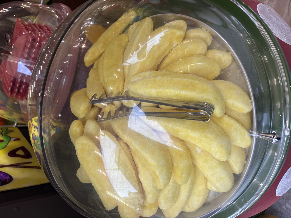The image displays a close-up view of a candy display located in a retail establishment in Alghero, Italy. A clear, domed plastic or glass container, featuring a silver knob-handle at its front base, is filled with numerous yellow, banana-shaped candies coated in granular sugar. A pair of silver-toned metal tongs rests atop the candies within the dome. The dome sits on a green-rimmed, circular base, which in turn is part of a larger red structure with white circular decorations. In the blurred background, another similar domed display case is partially visible to the right, containing red, rectangular candies arranged in stacks. Behind these displays, various out-of-focus colorful, abstract shapes and graphics are discernible, suggesting a vibrant store environment. No individuals are present in the frame.