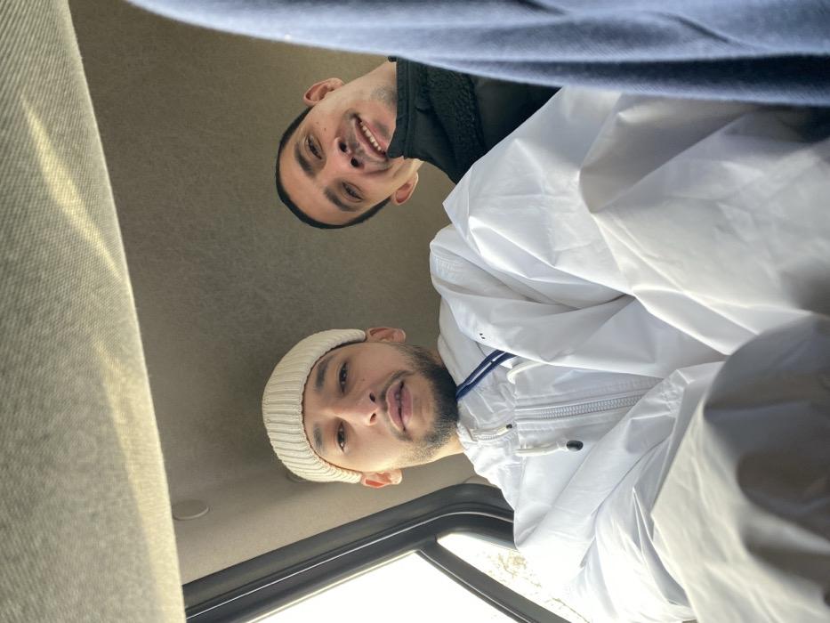 This image displays two adult males seated within a vehicle, captured from a low-angle perspective looking upward. The scene is situated in La Wantzenau, France. The individual positioned on the left side of the frame has light skin, a short beard, and a mustache. He is wearing a light-colored, ribbed beanie and a white zippered jacket with a blue drawstring detail. His eyes are open, and he is looking directly at the camera with a neutral expression. His upper torso and head are prominently featured. The second individual, on the right, is partially obscured by the first subject and a dark blue fabric visible on the extreme right. This male also has light skin and short, dark hair. He is smiling, revealing his teeth, and his gaze is directed towards the camera. He wears a dark-colored jacket, possibly black, with a visible textured collar or trim. The background consists of the light grey, upholstered ceiling of a vehicle interior. A window frame is visible to the left of the individual on the left, indicating external daylight. No discernible details of the exterior are present. The overall lighting suggests daytime conditions.