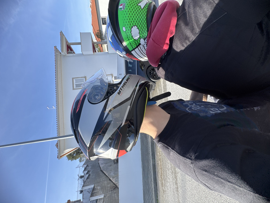 The scene is an outdoor daylight capture in Mirandela, Portugal, featuring two individuals positioned in the foreground. The person on the left wears a grey, black, and red MT Helmets Targo full-face motorcycle helmet with a partially raised clear visor, and a black short-sleeved t-shirt displaying a "Hard Rock Cafe" logo. A blue chin strap buckle is visible below the helmet. To the right and slightly behind, a second individual is seen from the rear, wearing a black long-sleeved garment, a red fabric neck covering, and a green, blue, and white AGV full-face motorcycle helmet adorned with cartoon-style graphics, including white speech bubbles. Both subjects are helmeted and positioned in a manner consistent with being on or near a motorcycle, which is not visible in the frame. The immediate environment consists of a paved surface. In the background, a dark-colored vehicle is partially visible. Further back, a white multi-story building with terracotta roof tiles and several windows stands under a clear blue sky. To the left, a concrete retaining wall with some vegetation ascends a slope. A slender metal pole extends vertically from the ground near the center of the frame.