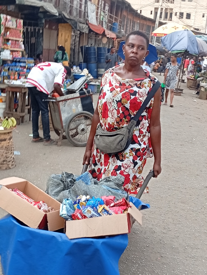 In an outdoor marketplace, a woman pulls a blue-covered cart laden with cardboard boxes overflowing with packaged goods. She wears a floral dress and a gray fanny pack. A man in a sports jersey stands near a separate cart with vegetables. Other people, stands, and umbrellas fill the background, creating a bustling market scene. Buildings rise above, adding to the crowded urban setting.