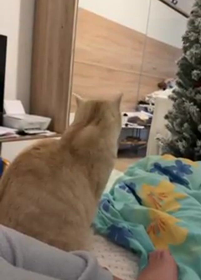 peach-colored cat sitting on a bed, looking to its left, then looking forward at the camera. A person is lying in the bed behind the cat, with one foot visible. The bed has a blue and yellow floral patterned comforter. A Christmas tree is visible in the background, as well as a wardrobe and other furniture.