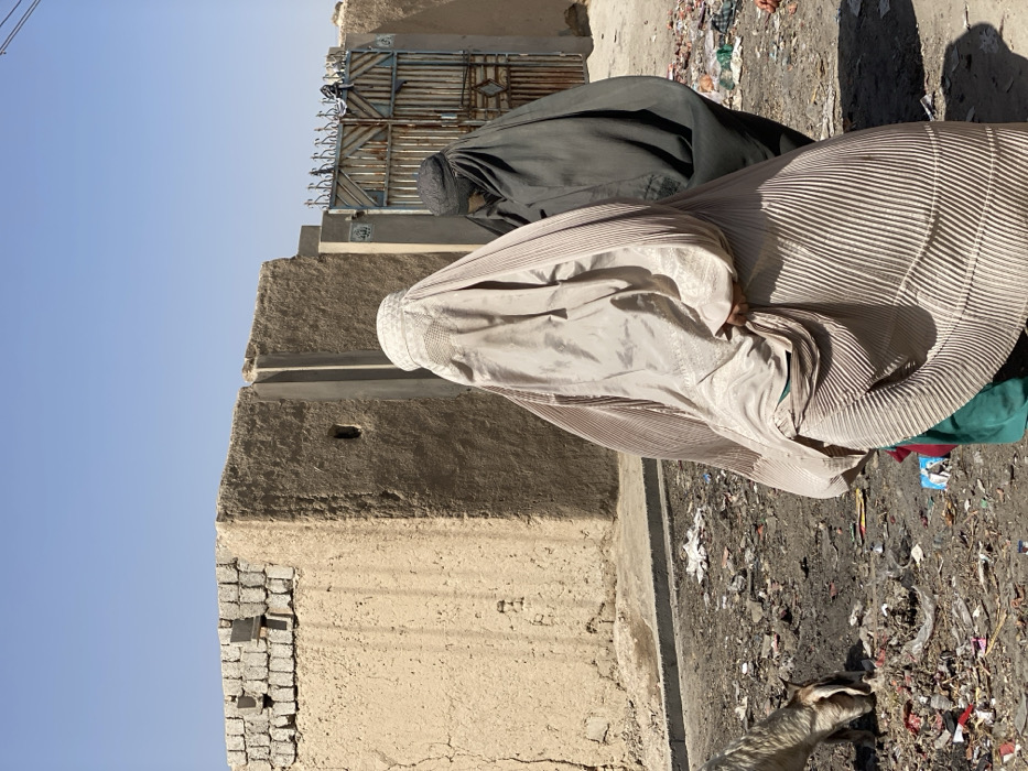 Two women wearing burqas stand outdoors on a sunny day. One burqa is light-colored with a striped pattern, while the other is dark. A crumbling, light-colored building borders the area, featuring exposed brick. A metal gate is visible. Trash and debris cover the ground, and an animal, possibly a goat, is near the bottom edge. The sky is clear and blue.