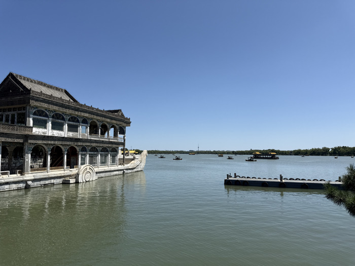The image showcases a tranquil lake scene under a clear blue sky. On the left, an ornate, aging building with a boat-like structure extends into the water. Small boats dot the lake's surface, with tree-lined shores visible in the distance. A floating dock is positioned in the middle ground, adding depth to the composition. The overall atmosphere is serene and evokes a sense of historical grandeur.