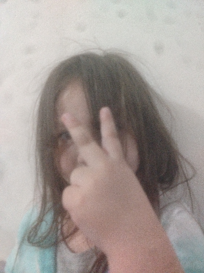 The image displays a severely blurry and grainy, low-resolution close-up of an individual, likely a child or young adolescent, in an indoor setting. The subject, positioned centrally, has long, dark, disheveled hair framing their face. One eye is faintly visible on the left side of the frame. The individual is wearing a light blue garment over a grey undergarment. Their right hand is raised in front of their face, forming a "peace sign" gesture with the index and middle fingers extended upwards, obscuring a significant portion of the face. The background is a plain, light-colored surface, possibly a wall, devoid of any discernible features or objects. The visual information within the image is insufficient to determine a specific location within the city of Strasbourg, France, or any other geographical area; it appears to be a generic indoor environment.