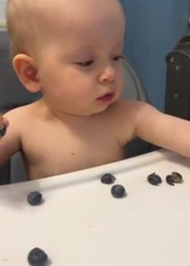 A baby sits in a high chair at a white table. The child is fair-skinned with pale hair and has a few blueberries spread across the table in front of them. The child picks up a blueberry, looks around the room, and eats it. A small part of the high chair is visible behind the baby. A blue curtain is in the background. A cartoon plays in the background.