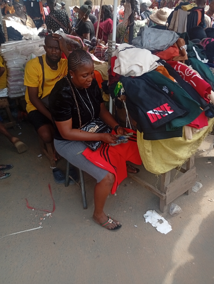 This image captures a bustling outdoor market scene in Nkwelle, Nigeria. In the foreground, an adult female with intricate cornrow braids is seated on a dark stool. She wears a black velvet short-sleeved top, a grey skirt, and black flat sandals with green, red, and gold embellishments. Her left hand rests on a black shoulder bag with a silver chain strap, while her right hand is actively sorting or counting a stack of Nigerian Naira notes, with a red garment draped over her lap. Behind her and slightly to the left, an adult male with a short beard and close-cropped hair is seated on a wooden structure. He wears a bright yellow t-shirt and dark shorts, with a dark strap across his chest. His left hand rests on his forehead, and he looks forward with a neutral expression. To the right of the woman, a wooden market stall displays a large, irregular pile of folded and draped clothing, including t-shirts, shorts (one black with "DIVE" written in white and red), and other assorted garments in colors like white, beige, red, dark green, and black. A yellow fabric or sack is visible beneath the clothing pile. The background is densely populated with numerous blurred figures of people walking or browsing, along with additional market stalls and clothing racks, indicating a crowded commercial environment. The ground surface is light brown, possibly worn asphalt or dirt, and is scattered with debris including crumpled white paper fragments, a reddish-brown string, and small stones. Shadows are present on the ground, suggesting an outdoor, daylight setting.