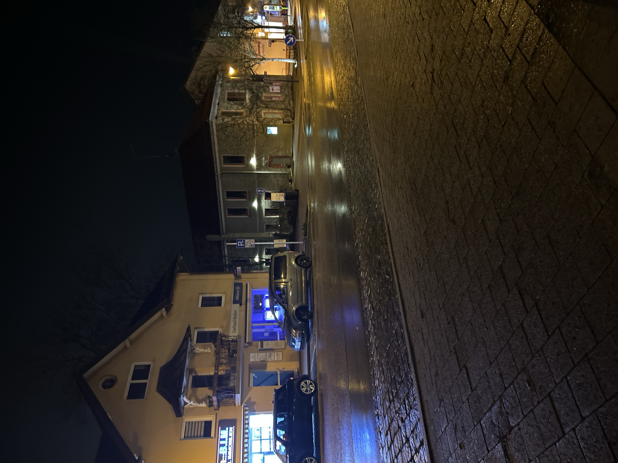 This nighttime image depicts an urban street scene in Gauting, Germany, specifically in the vicinity of Bahnhofstraße 17, identifiable by the "Gerhard Reden Allianz" office sign visible. The environment is characterized by wet surfaces reflecting artificial light, indicating recent precipitation. To the left, a multi-story yellow building occupies the foreground. Its ground floor houses two businesses: "B.I.M. IMMOBILIEN" and "Gerhard Reden Allianz," both indicated by illuminated signs. The interior of the Allianz office emits a distinct blue light. The first floor of this building features a decorative metal balcony railing, and an upper gable includes a prominent round window. Two vehicles are parked parallel to the wet curb: a dark-colored compact car on the left and a dark gray minivan positioned centrally. The street itself is visibly wet, creating strong reflections of the various light sources, including the blue light from the Allianz office and warm yellow light from streetlights. The foreground is composed of dark, wet rectangular pavers forming a sidewalk, separated from the street by a concrete curb. To the right of the parked vehicles, a two-story grayish building with a reddish-brown roof stands. Its exterior is partially covered in bare climbing vegetation, and its windows feature red trim. Further to the right, additional buildings with illuminated windows are partially visible behind bare deciduous trees. Street furniture and signage include a blue parking sign displaying "P 2h," a circular blue sign with a white arrow indicating a mandatory right turn, and another circular blue sign with a white pedestrian symbol. The background consists of a dark night sky with silhouettes of bare trees. No human subjects or active interactions are present within the depicted scene.