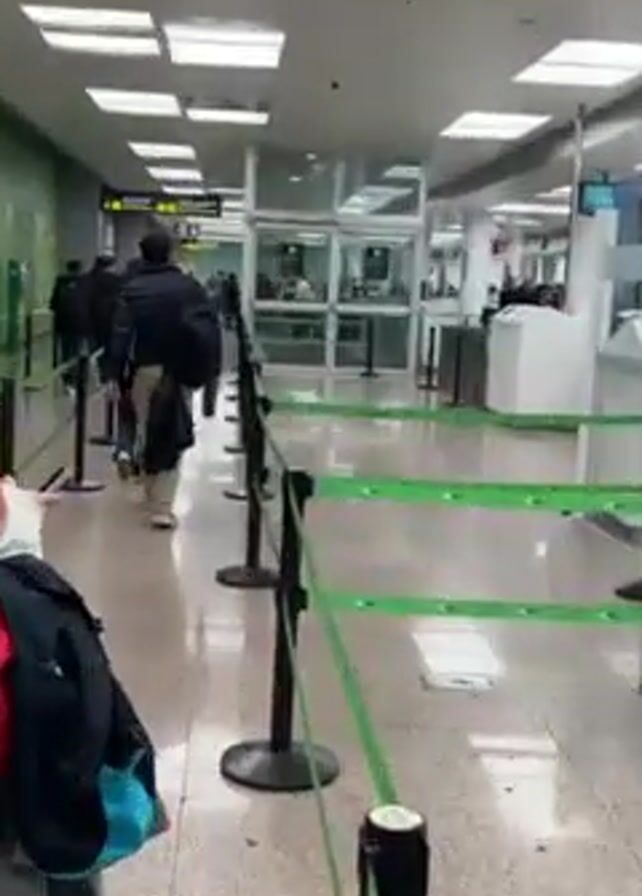 n indoor scene in what appears to be an airport or a similar transit facility. Several individuals are lined up, navigating a queue guided by black posts connected with green straps. The people are walking toward a glass-enclosed area where personnel can be seen working behind desks. The person filming is also in the queue. The background shows a bright, sterile environment with fluorescent lighting fixtures in the ceiling. There are signs with directions displayed above. The person recording appears to be carrying a red bag and a black backpack.