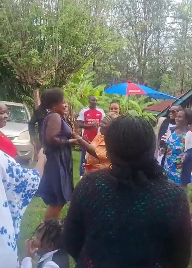 A group of people, mostly women, are gathered in a grassy outdoor space surrounded by trees and buildings. They are dancing and clapping. Some are dressed in brightly colored or patterned clothing, while others wear more subdued outfits. There is a blue and red umbrella visible in the background. A few men are among the crowd, one wearing a red sports jersey. A car is partially visible in the background. The camera is positioned behind one of the women, capturing the scene from her perspective. The atmosphere appears celebratory.