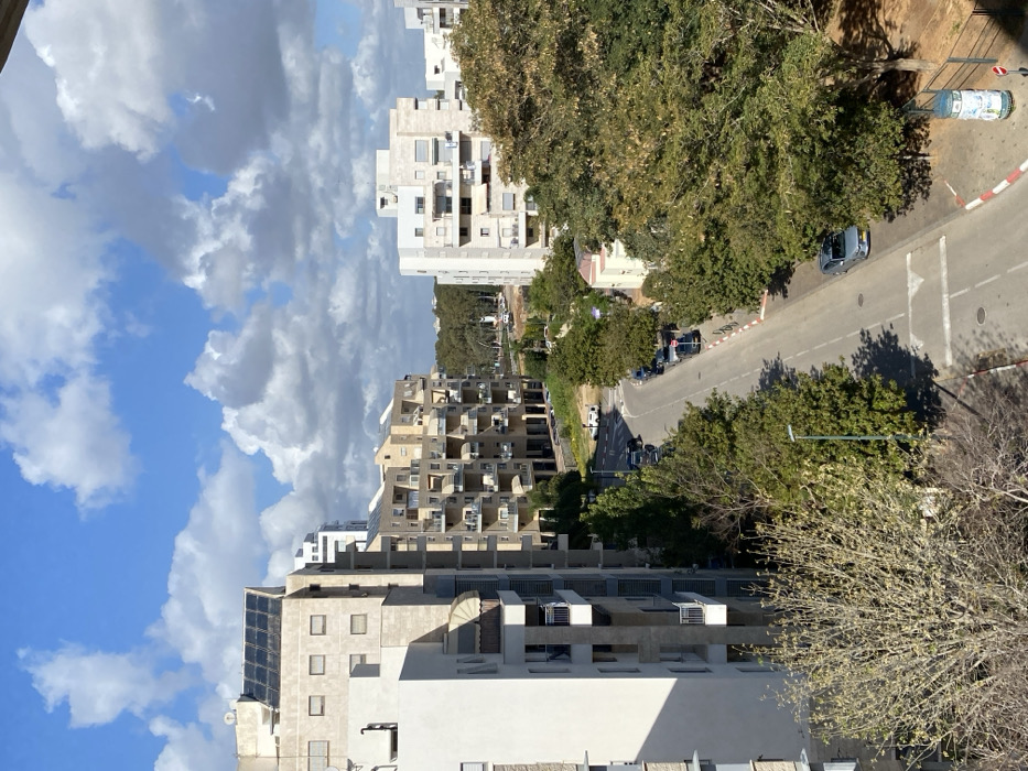 This aerial shot showcases the city of Netanya, Israel, featuring a mix of residential buildings and lush greenery. The scene includes diverse architectural styles, from modern, high-rise structures to complexes with terraced balconies. A road winds through the urban landscape, lined with trees and parked vehicles. A large cloudscape dominates the sky, complementing the sunny, daytime environment. The overall impression is of a vibrant, densely populated coastal city blending urban living with natural elements.