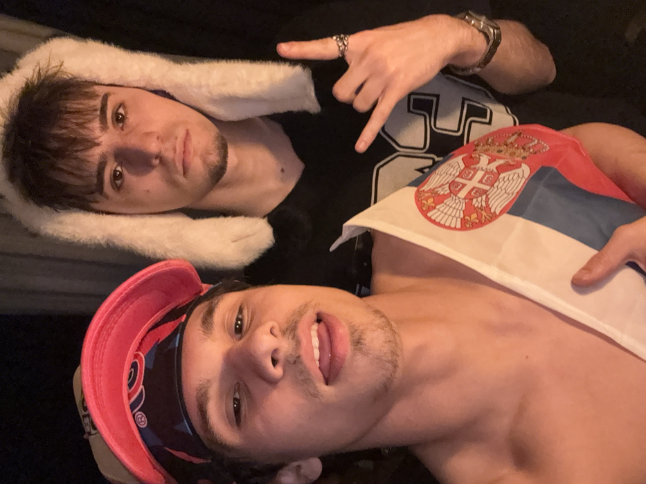 Two young adult males are depicted in a dimly lit, close-up photograph, with the location identified as Sofia, Bulgaria. The individual in the foreground, positioned to the left, has dark hair, a light complexion, and stubble around his jawline. He wears a blue and black patterned bandana under a bright pink visor and is shirtless. His mouth is slightly open, with his tongue partially visible. He holds a Serbian flag, horizontally striped red, blue, and white, featuring the national lesser coat of arms with a white double-headed eagle, draped over his left shoulder. The second individual, positioned behind and to the right, also has dark hair with bangs and a light complexion, wearing a white, fluffy hood with prominent ears and a dark shirt with a large, light-colored "23" graphic. His expression is neutral. His right hand is raised, performing a "rock on" hand gesture, and he wears multiple rings on his fingers. A watch is visible on his left wrist. The background is dark and indistinct, suggesting an indoor or poorly lit outdoor setting.