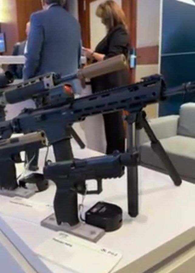 static shot of a display table at what appears to be a trade show or conference. On the table are several firearms: an AR-15 style rifle with a scope and bipod, and two pistols. The rifle is black with a tan suppressor and mounted optic. The pistols are black and appear to be high-end models. Small informational cards are placed in front of each firearm, with the word "Pistolel MPS" visible on one. In the background, two people, a man in a suit and a woman in black attire, are seen engaged in conversation. The environment suggests a professional setting with modern decor, including a gray couch and large company signage. The overall atmosphere is one of a product showcase within a business-oriented event.