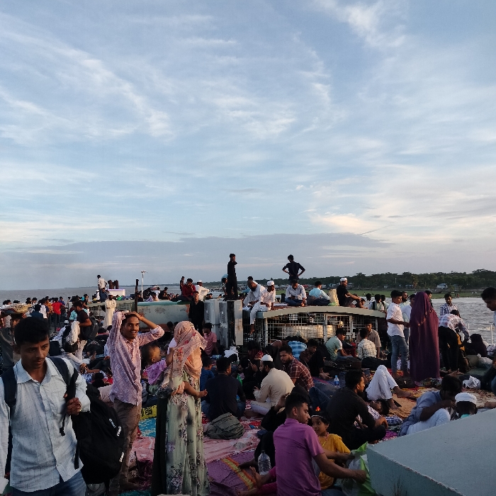 A crowded outdoor scene under a partly cloudy sky. Many individuals are present, some standing and others seated on mats. The crowd appears to be predominantly male, with a few women visible. Some individuals are wearing traditional Muslim attire, including head coverings. A structure with a metal grate and concrete elements is surrounded by people. A body of water is visible in the background, with trees lining the shore.