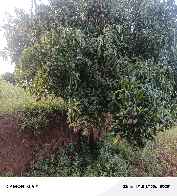 A mango tree laden with ripe mangoes dominates the frame, its dense canopy shading the ground below