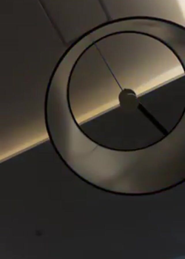 low-angle view of a round, lamp fixture hanging from a ceiling