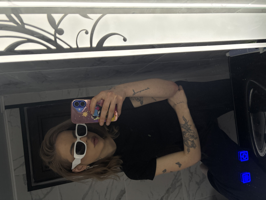 An individual is depicted taking a mirror selfie in what appears to be a modern bathroom in Tsarevo, Bulgaria. The subject, a person with shoulder-length wavy light brown hair, is wearing oversized rectangular white sunglasses, a black short-sleeved mock-neck top, and dark pants. The right hand holds a smartphone, specifically an iPhone with a dual-lens camera, encased in a pink cover adorned with multicolored animated characters, which is pointed towards the mirror to capture the reflection. The left arm is bent at the elbow, with the forearm resting across the body. Visible tattoos include several butterfly silhouettes on the left forearm, script on the left upper arm, a large floral design (possibly roses and leaves) on the right forearm, and another script tattoo above the right elbow. The subject also wears silver dangling earrings. The background features a large mirror reflecting marble-patterned wall tiles and a vertical illuminated panel with a dark, ornate, cut-out decorative overlay on the right side. A dark countertop with a sink basin is partially visible in the lower foreground, displaying two blue illuminated square icons.