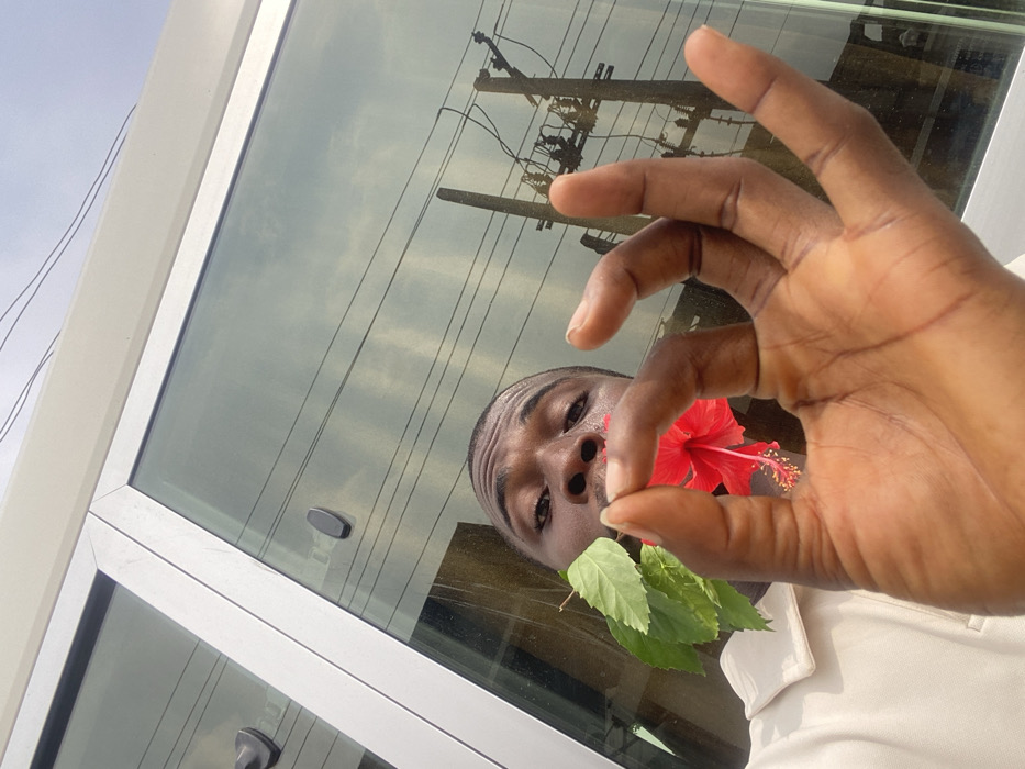 An adult male with dark skin is depicted in a close-up, low-angle shot, positioned in Langbasa, Nigeria. He faces the camera, wearing a light-colored collared shirt. His right hand is prominently featured in the foreground, holding a red hibiscus flower with visible stamens and a small leafy green branch. The flower is positioned near the subject's mouth and nose. Behind the subject, a large glass window or panel reflects an exterior environment. These reflections include multiple overhead power lines, at least two utility poles equipped with crossarms and insulators, and an overcast sky. White framing delineates the glass panel, and two small, dark-colored fixtures are visible on the reflective surface, possibly window hardware.