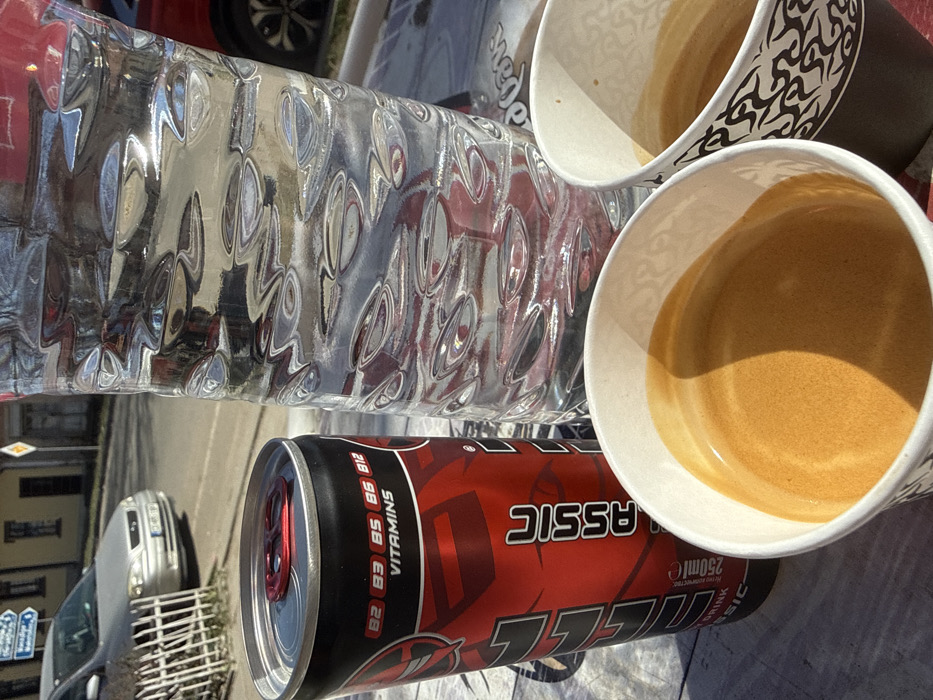 This image depicts an outdoor scene in Sarantsi, Bulgaria, under direct sunlight. In the foreground, resting on a light-colored surface, are three beverages: a red and black "BIG SHOCK CLASSIC" energy drink can (250ml) with a red pull tab, displaying "VITAMINS B2 B3 B5 B6 B12"; a tall, clear plastic bottle of water with a distinct rippled texture; and two white paper cups, each containing a liquid resembling espresso with visible crema. The water bottle exhibits reflections of the surrounding environment, including a red vehicle on the far right. Beyond the immediate foreground, a low white metal fence separates the viewing point from a paved street. A silver Opel Astra sedan is parked on the left side of this street, with its rear section and a Bulgarian license plate partially visible. Further in the background, a light-colored building with dark windows is present. A yellow diamond-shaped priority road sign is mounted on a pole near the center-right of the background, and a blue and white directional sign is visible on the far left. No individuals are present in the frame.